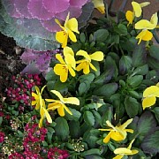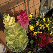 葉牡丹とスイートアリッサムとビオラと勝手に生えてきたナスタチウムの寄せ植え。