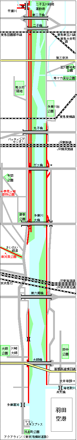 川崎側のガス橋と多摩川大橋のほぼ中間地点にある歩道橋のあるT字路から夢見ヶ崎動物公園を経て鶴見川へ到達することが出来る。