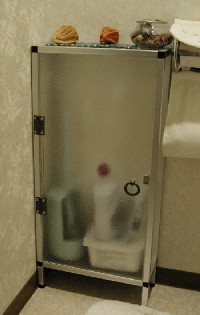 壁に接する部分と底に透明アクリル、正面の扉と壁に接していない部分に、目隠しの為の半透明アクリルを取りつける。正面の扉以外は、両面テープで張りつけ、扉は蝶番で取り付ける。