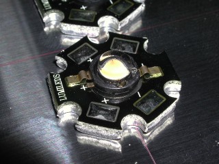 入手した、パワーLED。白色と電球色は、レンズの中や極性の記号が異なるので、間違って配線することはなさそう。