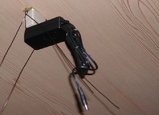 天井に、ACアダプタと吊り下げ用アルミ線をぶら下げる。