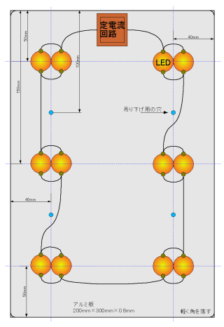 アルミ板にLEDの接着場所や、吊り下げ用の穴あけ位置を記入し、穴あけ後、安全の為、穴と角をヤスリで削っておく。